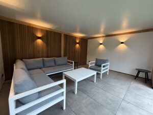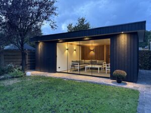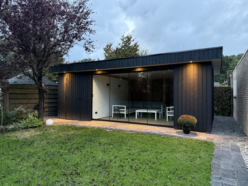 Het buitenverblijf bestaat uit een ruim zitgedeelte en een schuur die netjes is geïntegreerd in het ontwerp. Voor de afwerking is gekozen voor strakke wanden, een douglas constructie en ayous accenten. Meerdere stroom- en lichtpunten maken het geheel praktisch in gebruik.