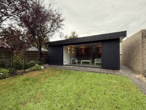 In Vroomshoop realiseerden we een strak buitenverblijf met schuur. De wens van de klant was een moderne uitstraling, een fijne schaduwplek en een praktische opbergruimte.