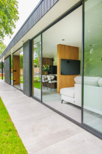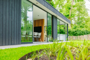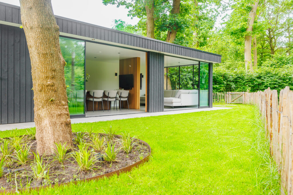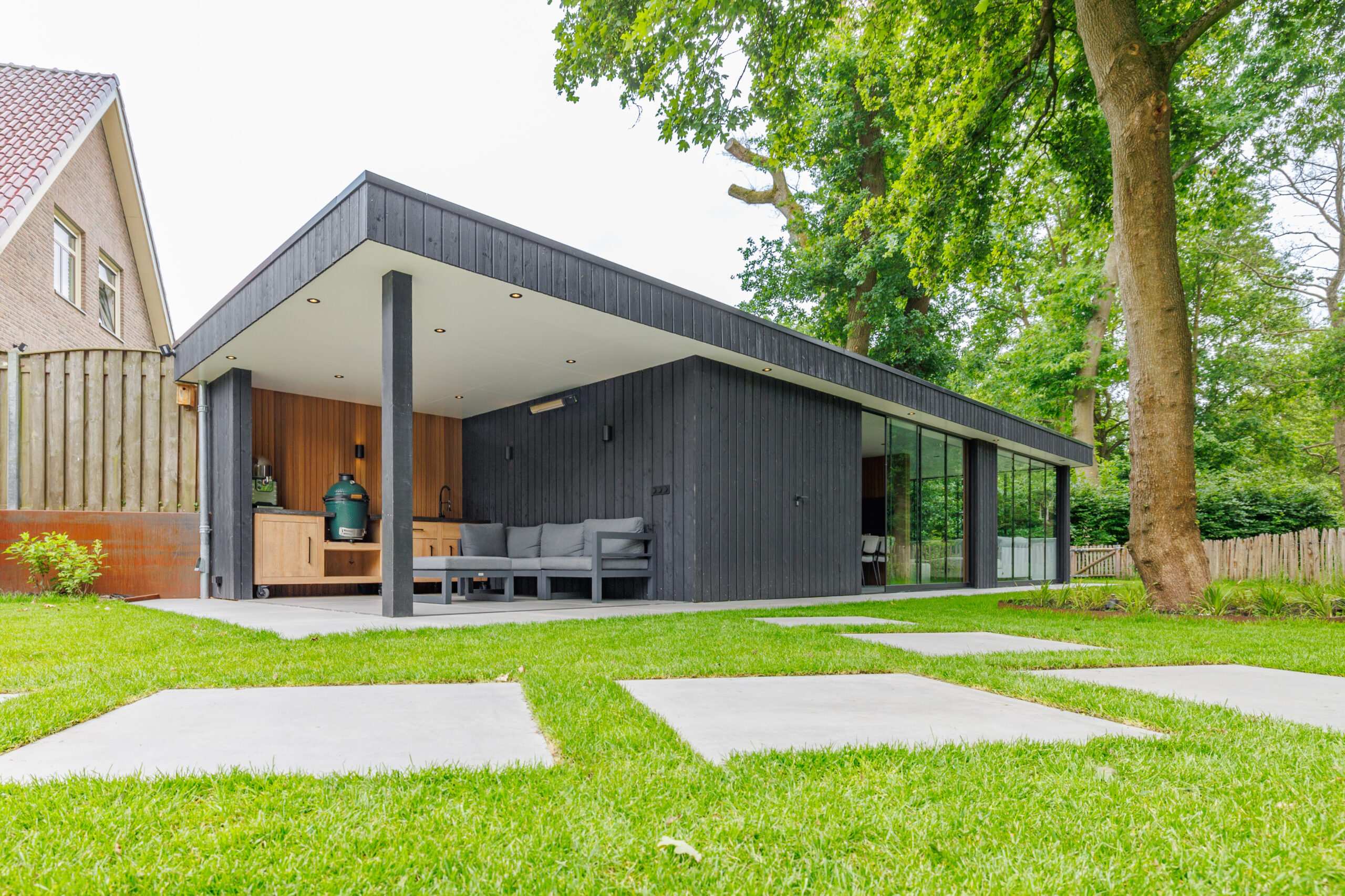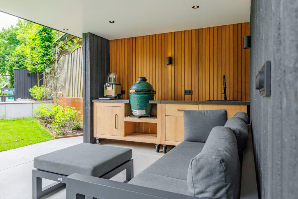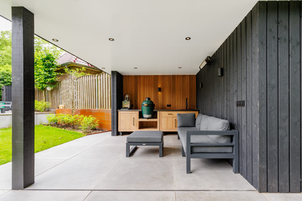 Voor dit project in Vriezenveen realiseerden we een complete buitenruimte met opbergruimte, een afgesloten deel voor het hele jaar en een open gedeelte voor een buitenkeuken.