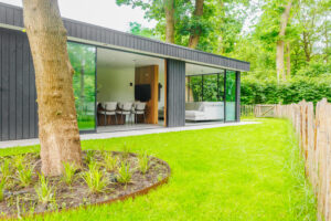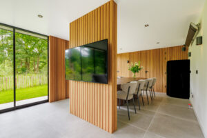 De afwerking bestaat uit channelsiding, thermisch ayous accenten, gestucte wanden en een keramische tegelvloer. Daarnaast zijn schuifwanden, een toilet en een aparte meterkast slim geïntegreerd, met deuren weggewerkt in de wandbekleding.